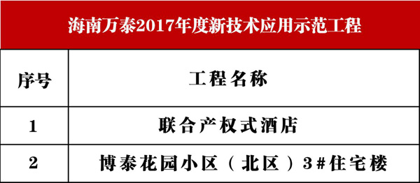 近日,海南省住房和城鄉建設廳發布公告,公布了2017年度海南省建筑業新技術應用示范工程立項評審結果,共計24項工程獲評新技術示范工程。其中,海南萬泰建筑住工程有限公司承建的“聯合產權式酒店“和”博泰花園小區(北區)3#住宅樓“兩個項目名列榜單。