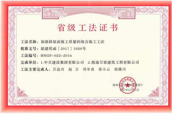 2017年12月5日,海南省住房和城鄉(xiāng)建設(shè)廳發(fā)布公告,公布了2016年度海南省省級(jí)工法名單。海南萬泰建筑工程有限公司申報(bào)的兩項(xiàng)工法(定型化電梯井操作平臺(tái)提升架施工工法、加強(qiáng)斜屋面施工質(zhì)量的組合施工工法)名列榜單,且得票數(shù)均為13票,得票率百分之百。