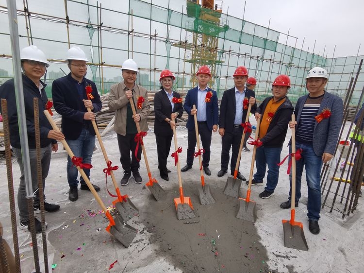 大家在做好安全防護措施后一起走上了頂樓,伴隨著禮花的炮鳴聲,共同為項目最后一塊區域澆筑混凝土,宣告了項目主體結構封頂正式完成。