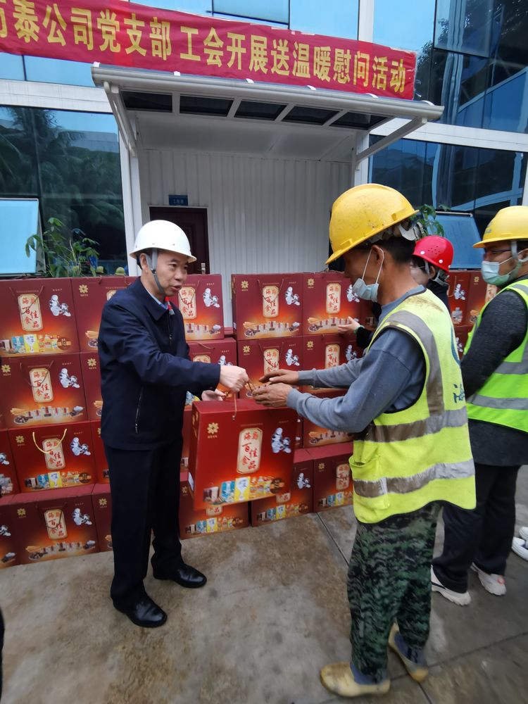 新春送溫暖,真情暖人心。2022年1月11日,在新春佳節(jié)即將來臨之際,省建設工會,海南萬泰公司黨支部、工會赴省政務中心二期項目開展新春慰問一線工人送溫暖活動,為一線工人送去油米、年貨等暖心物資。省建設工會常務副主席劉志偉、辦公室主任黃符杰,萬泰公司常務副總、工會主席顏利,黨支部書記孟晨,工會副主席林慧等有關人員參加本次活動。