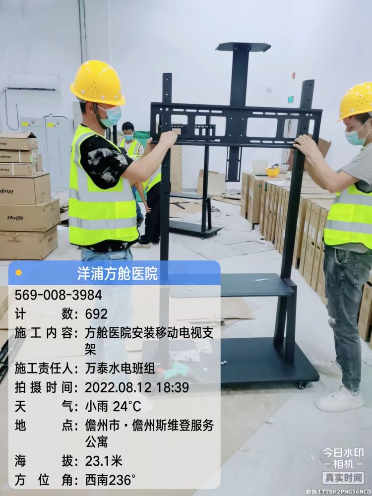支援隊到達現場后,迅速進入“戰斗狀態”,搬運、開槽、彈線、分線、安裝等各道工序快速展開。放眼望去,盡是忙碌的身影。大家步履匆忙,但眼神堅定,臉上汗珠密布,但無心擦拭,每一個人都在和疫情賽跑,和時間賽跑,為生命勠力同心。