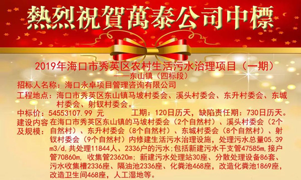 熱烈祝賀海南萬泰中標2019年海口市秀英區農村生活污水治理項目(一期)-東山鎮(四標段)