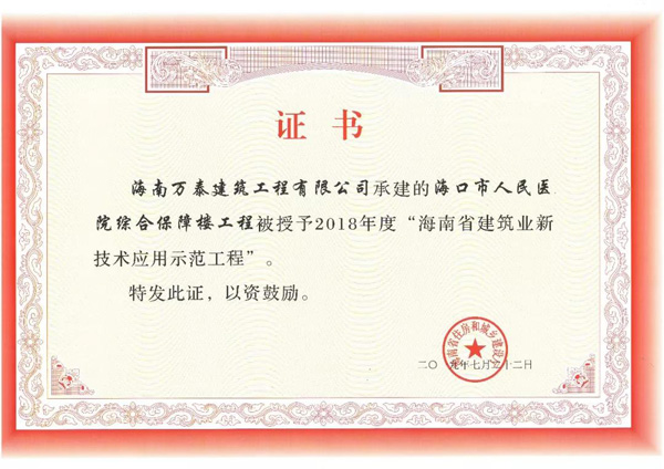 近期,海南省住房和城鄉建設廳下發了《關于公布2018年度海南省建筑業新技術應用示范工程的通知》,由我司承建的??谑腥嗣襻t院綜合保障樓項目,獲評“2018年度海南省建筑業新技術應用示范工程”。