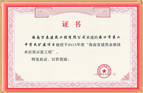 由海南萬泰建筑工程有限公司承建的“海口市第二中學改擴建項目”被海南省住房和城鄉建設廳授予2015年度“海南省建筑業新技術應用示范工程”。