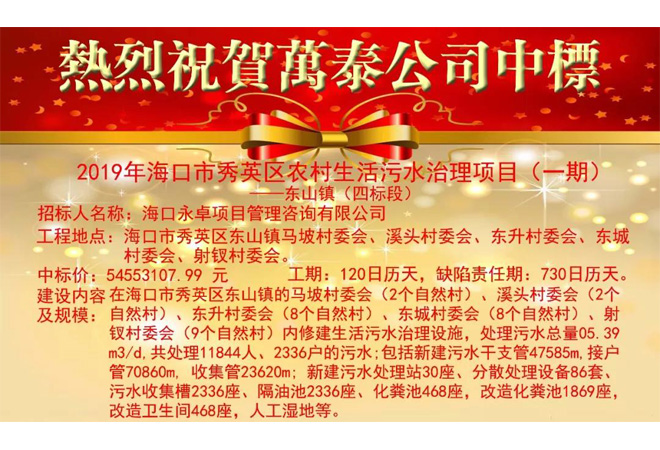 熱烈祝賀海南萬泰中標2019年海口市秀英區農村生活污水治理項目(一期)-東山鎮(四標段)