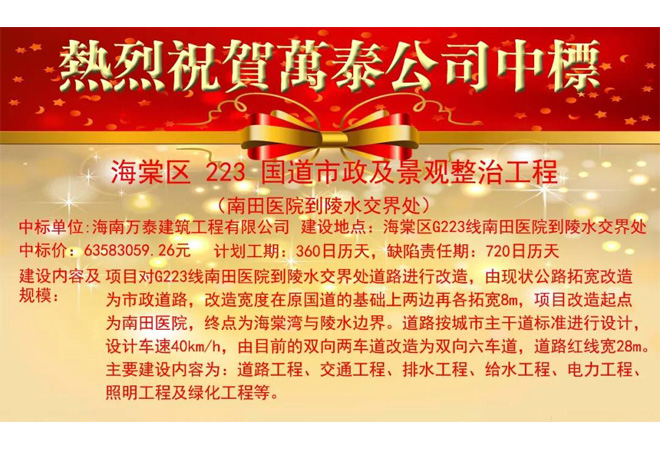 熱烈祝賀海南萬泰中標海棠區223國道市政及景觀整治工程南田醫院到陵水交界處項目