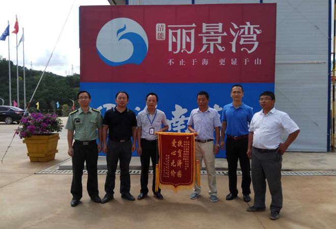 2017年4月25日上午,海南省紀委扶貧工作隊隊長勞文、省紀委駐毛道村第一書記李朝、五指山市毛道鄉(xiāng)武裝部部長胡國萬一起將一面書有“扶貧濟困、愛心無價”的錦旗送到海南萬泰清能麗景灣項目部,感謝五指山清能置業(yè)有限公司、海南萬泰建筑工程有限公司對五指山毛道鄉(xiāng)貧困戶危房改造工作的大力支持。